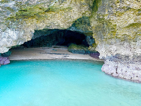 小さなジャングルを抜け、足がつく程の浅い海を15分程歩くと海に面した小さな洞窟が。